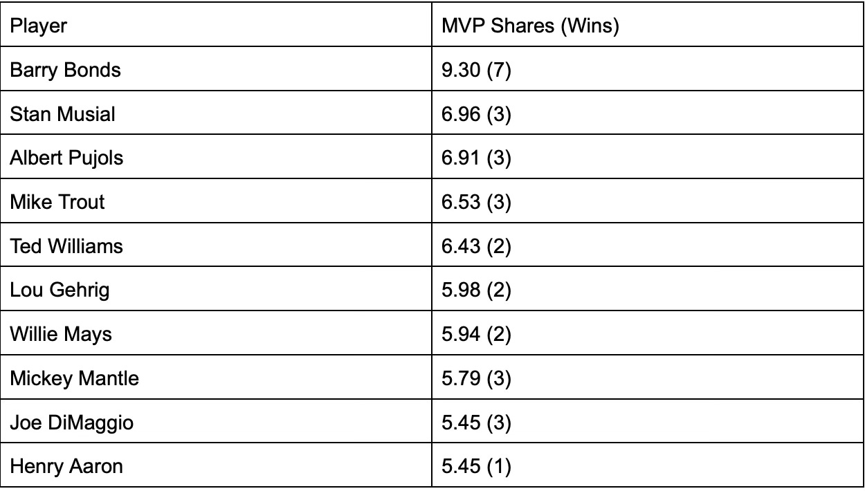 One metric I am falling in love with is MVP Shares, a metric which gauges how much support a player has received in MVP voting. For context the top 10 in MVP Shares are some of the absolute all time best players ever: