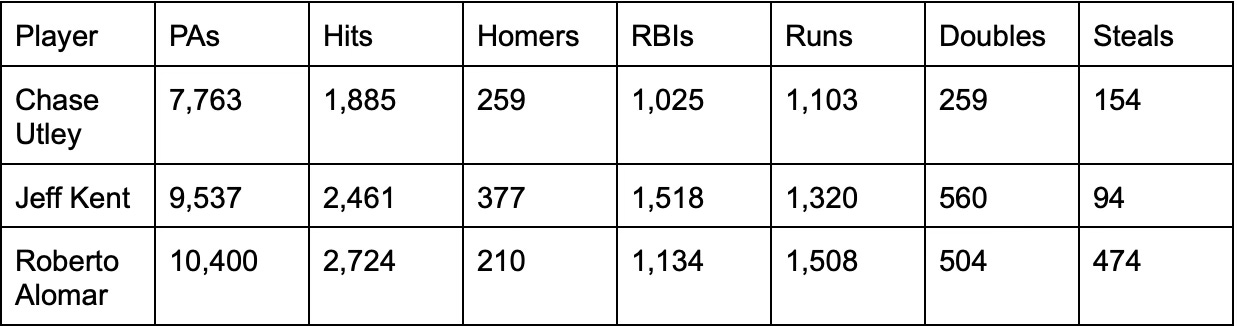Utley debuted late for a Hall of Famer at 24, became a regular at 26, and retired at 39. Overall his 16 seasons is low for a Hall of Fame player, as are his counting stats of 1,885 Hits, 259 Homers and 154 steals. But the reason why his counting stats are low is because he rarely played full seasons; for his career he only played in 130 games or more 8 times. In contrast, contemporary Jeff Kent (who played 17 seasons) played 130 games or more 11 times, and Roberto Alomar (also 17 seasons) had 13 such seasons. Resulting in Kent & Alomar receiving far more playing time. Here are their counting statistics: