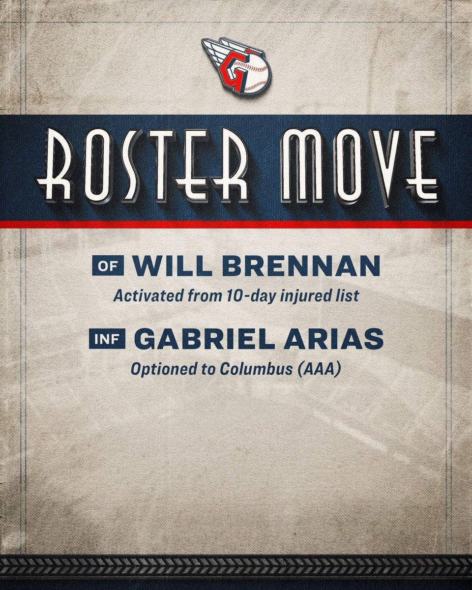 The next big move, in this case entirely internal, replacing Gabriel Arias with Will Brennan. As far as I am concerned: Arias’ demotion has been a long time coming. I have not seen what value he brings to the roster for some time. Since 2023 Arias has batted .214/.269/.353 (OPS+ 73), he is not a good defender (although he does have amazing arm strength), and he does not run the bases particularly well. The only benefit to Arias right now is his versatility: he’s played every position on the diamond besides catcher. But, Cleveland already has two other players who can do this on the roster: Daniel Schneemann, and another player I will discuss in a bit. Furthermore Cleveland also boasts first time All-Star David Fry who can play both corner infield and outfield positions and catch. The Guardians do not need yet another versatile bench piece.